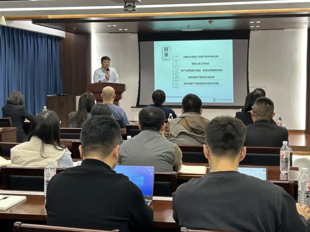 随后,李闯律师正式开启分享,他以“破产业务是否为高端业务”之问切入,深刻阐述了管理人在破产程序中的核心角色与价值。讲座内容系统全面,涵盖五大板块:一是正确认识管理人在破产案件中的作用与市场定位;二是结合河北实践,深入分析了管理人名册制、分级管理机制及近年破产案件受理情况;三是详细梳理了管理人的工作体系,从横向部门协作与纵向程序推进两个维度展开;四是解读了国家及地方层面破产法律制度与配套政策的建设情况;五是展望了破产法修订、个人破产、预重整、合并重整等前沿热点问题。李闯律师结合其承办的多个重大重整案例,将复杂制度与生动实践相融合,讲解深入浅出,引得在场听众频频记录。
